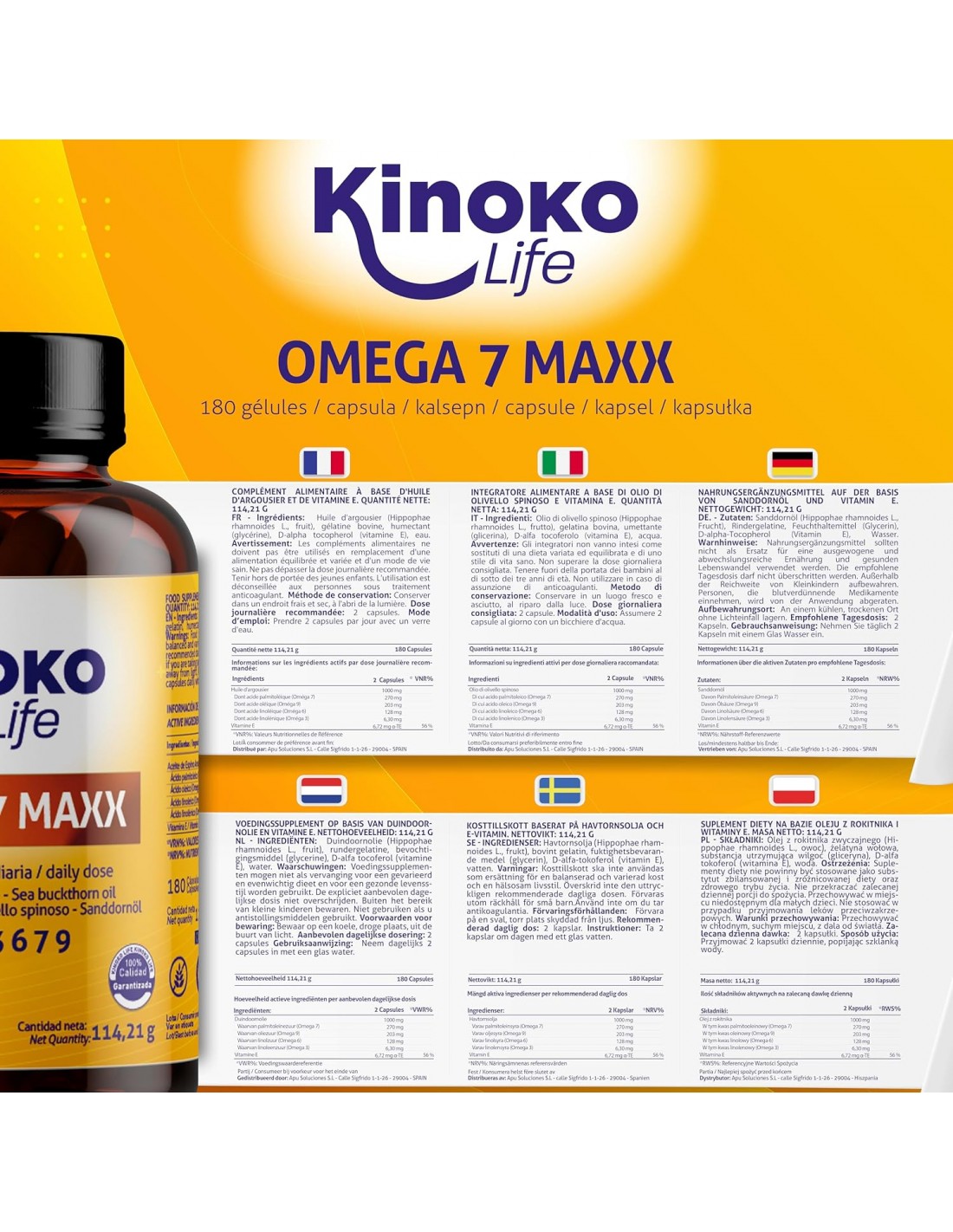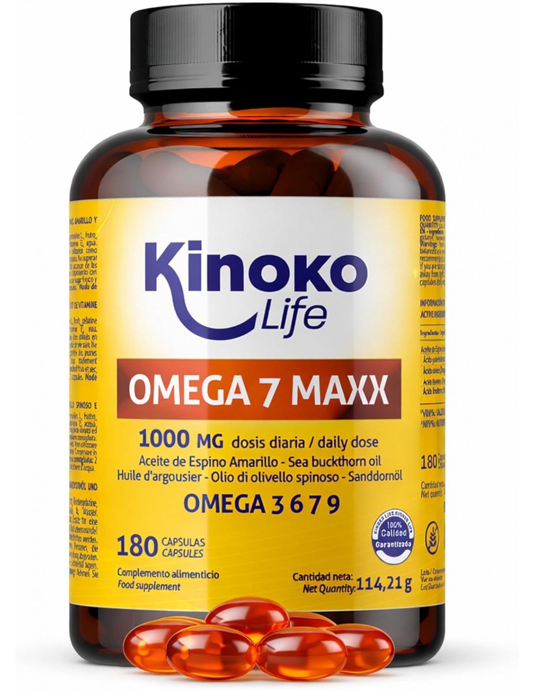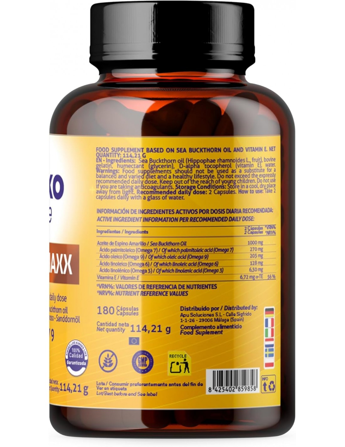 OMEGA 7 MAXX 180 Cápsulas (3 Meses) Aceite de Espino Amarillo 1000 mg Dosis Diaria (500 mg/Cápsula) Omega 3 6 7 9 + Vitamina E Piel y Mucosas Confort Ocular Natural y Sin Gluten