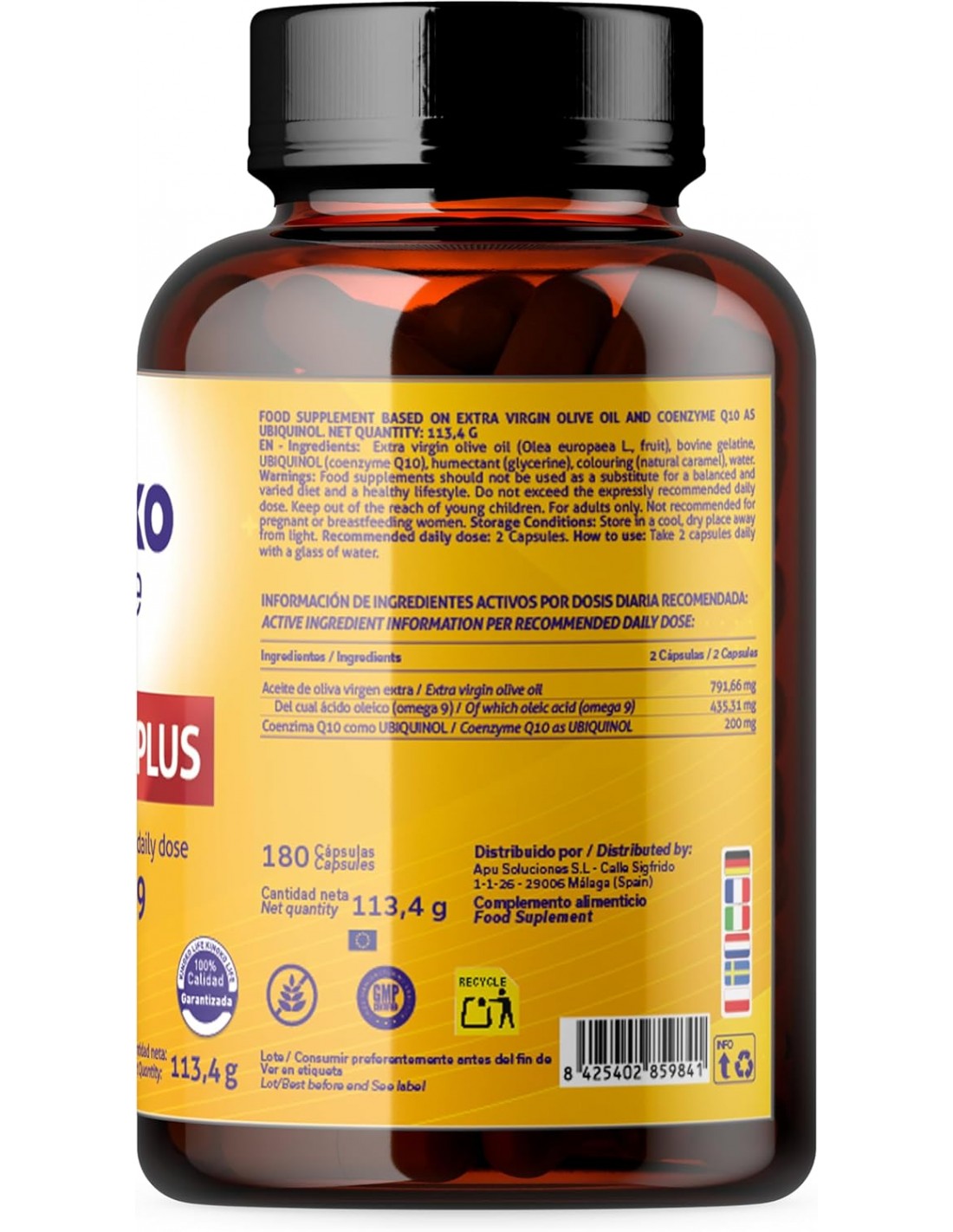 Nuestra fórmula utiliza Aceite de Oliva Virgen Extra como vehículo principal en la absorción del Ubiquinol (Coenzima Q10 reducida). El Omega 9 actúa como soporte lipídico natural que ayuda a la asimilación del ubiquinol, para aprovechar mejor cada toma dentro de tu rutina diaria.
