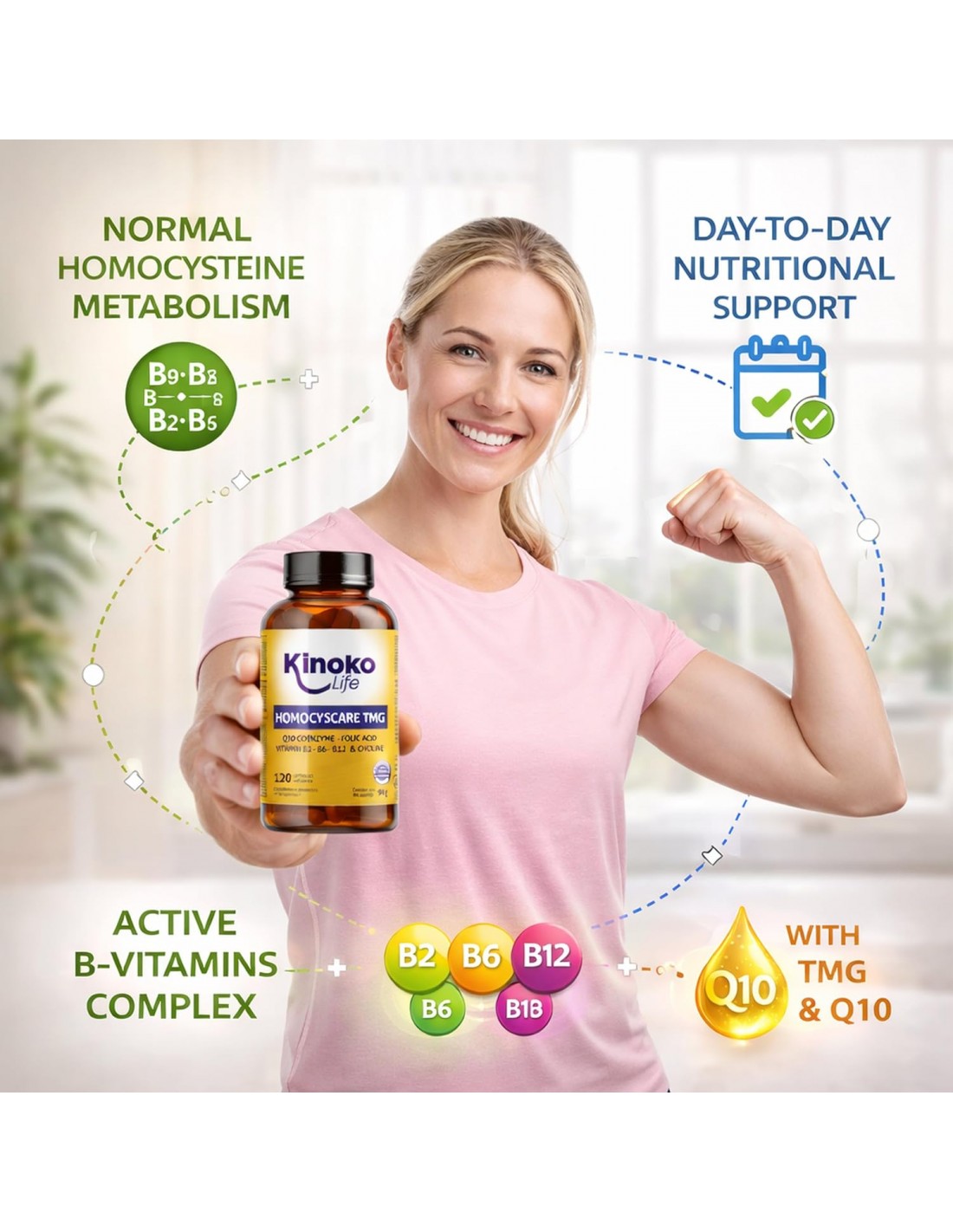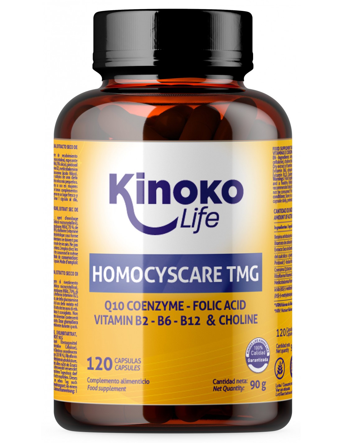 Con vitaminas B6 (P-5-P), B12 (metilcobalamina), B2 (riboflavina) y B9 (folato/ácido fólico). Las vitaminas B6, B12 y B9 contribuyen al metabolismo normal de la homocisteína. Ideal dentro de una dieta variada y un estilo de vida saludable.