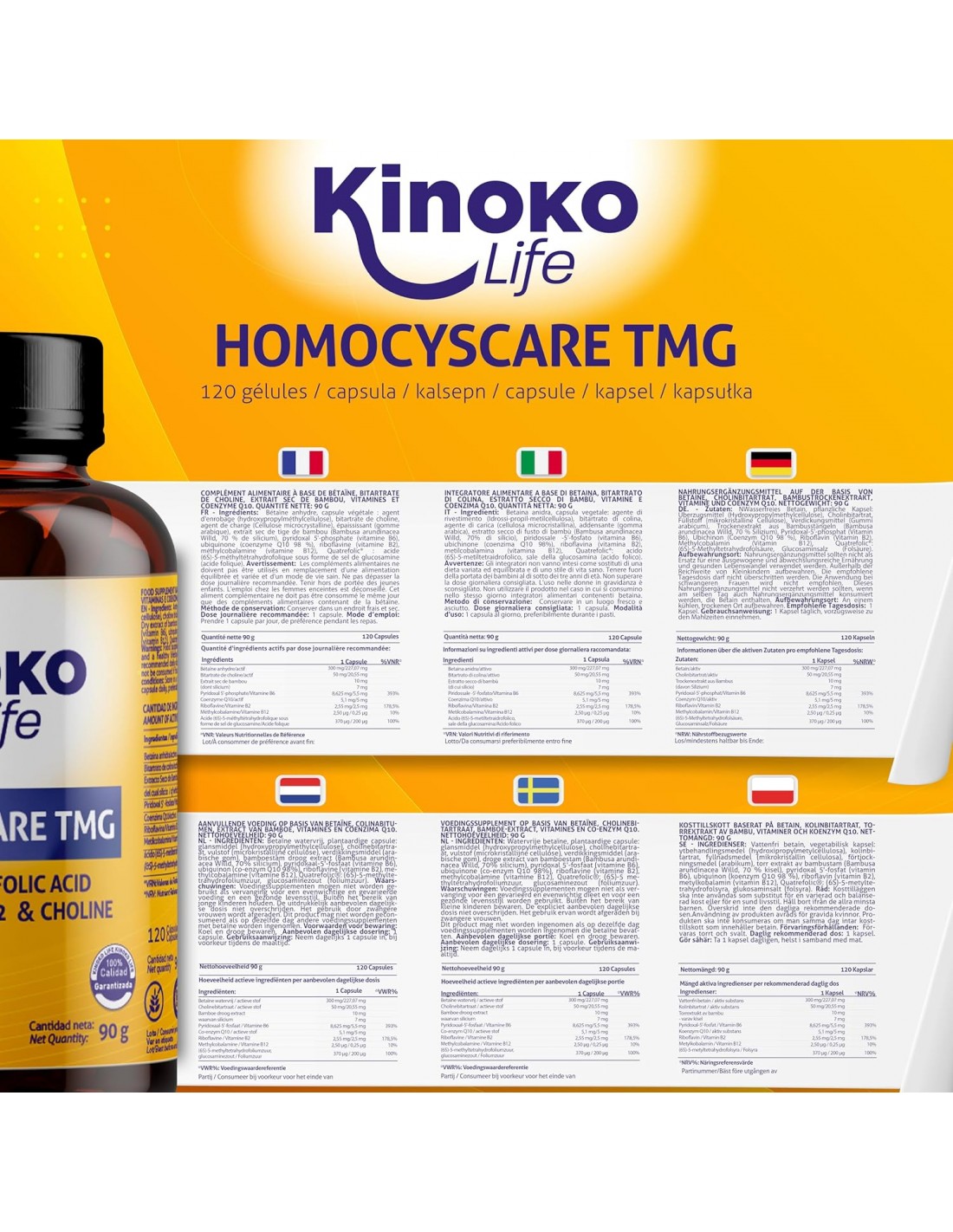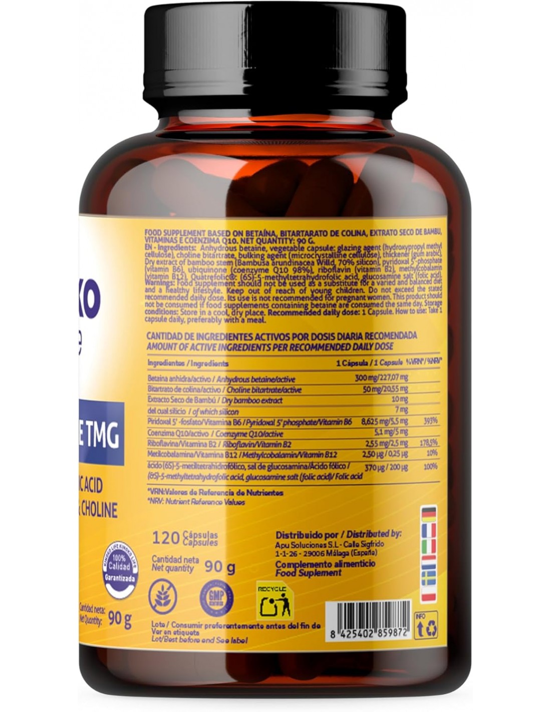TMG (Betaína Anhidra), Colina, CoQ10, Silicio (Bambú), Vit. B2, B6 (P-5-P), B9 (Quatrefolic), B12 (Metilcobalamina).
